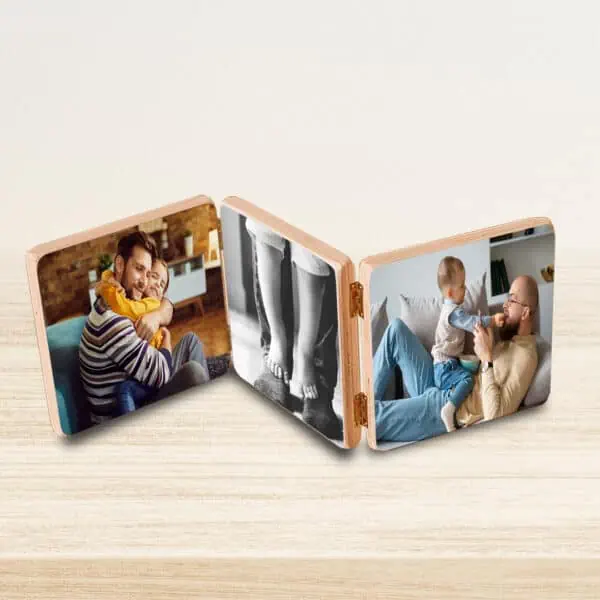 Conjunto de 6 fotos impressas em papel fotográfico e montadas em 3 blocos de madeira, com cantos arredondados e dobradiças.
