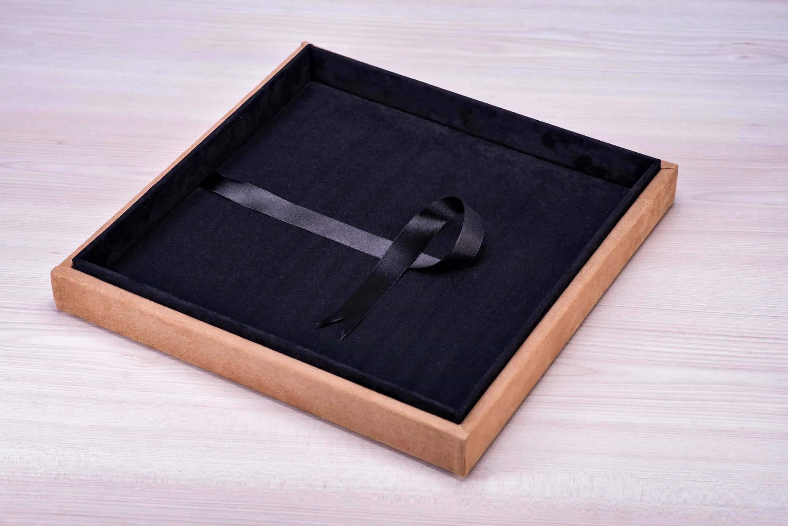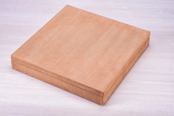 Caixa sintética revestida de tecido ou courino.