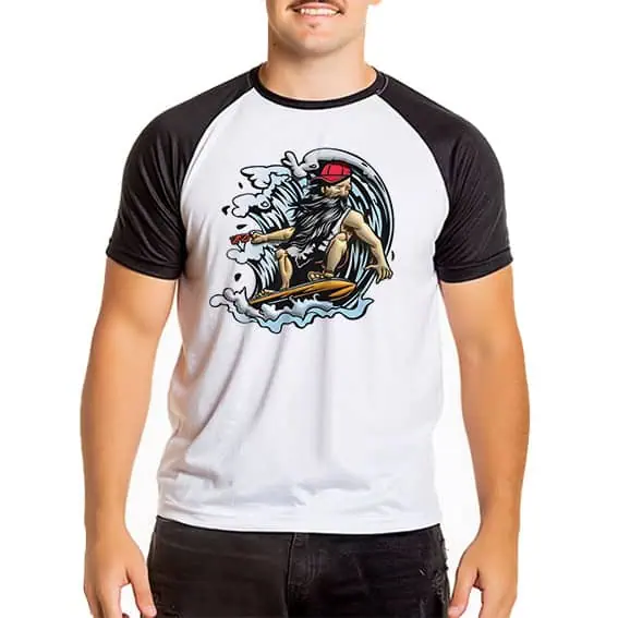 Camiseta branca em poliéster, gola redonda e mangas pretas