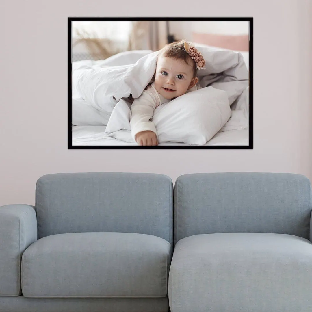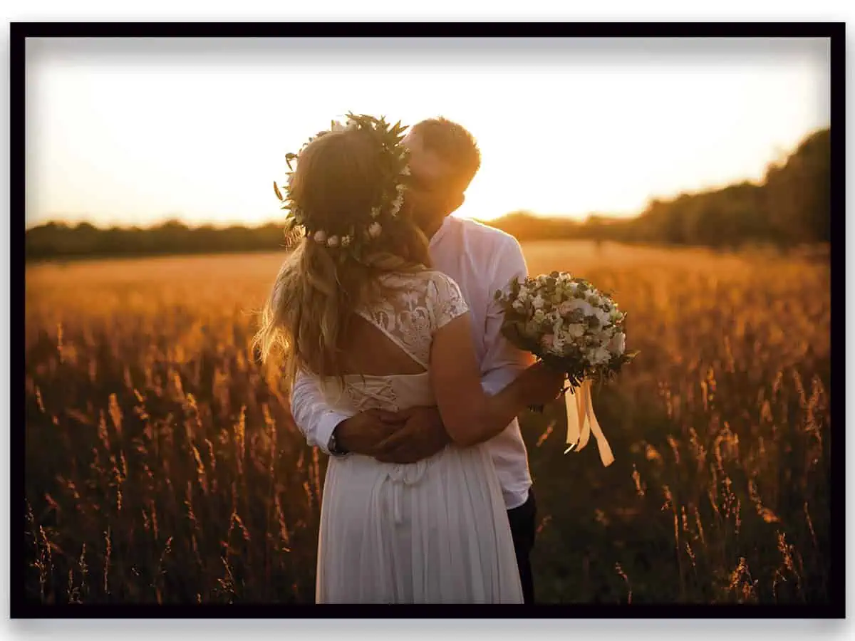 Foto impressa em papel fotográfico laminado, colado em chapa de PVC 2mm, com moldura em alumínio, disponível nas cores prata e preto.